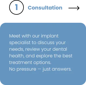 Meet with our implant specialist to discuss your needs, review your dental health, and explore the best treatment options.