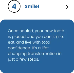 Once healed, your new tooth is placed and you can smile, eat, and live with total confidence. It’s a life-changing transformation in just a few steps.